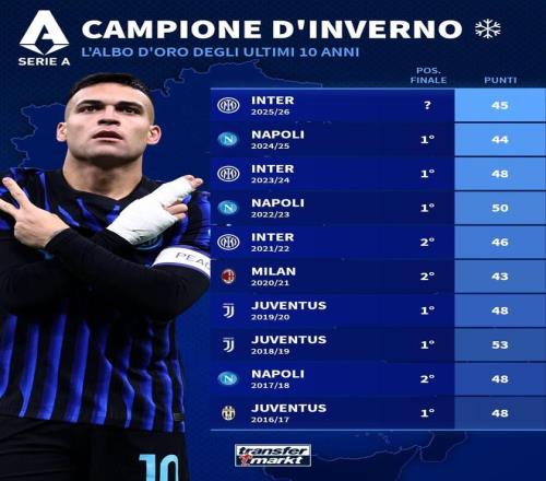 国米45分拿到意甲半程冠军,此前9个赛季半程冠军6队最终夺冠