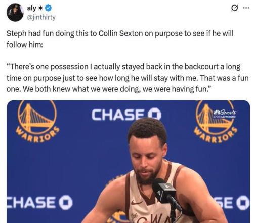 赛后库里谈及这一幕时表示:“那个回合我是故意在后场待了好久,就是想试试他能跟我多久,我俩都心知肚明在干嘛,玩得挺开心。”