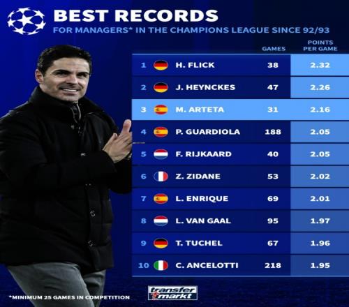 欧冠改制后主帅场均积分榜:弗里克居首,阿尔特塔第三,瓜帅第四
