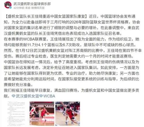 这件事情的起因,是中国女篮为了备战2026年国际篮联女篮世界杯资格赛,篮协对国家女篮的集训名单进行了细致的调整与必要的增补,来自武汉盛帆黄鹤女篮的队长王佳琦凭借出色表现成功入选国家队征召名单,她在本赛季表现很强势,作为组织后卫,她场均能够攻献11.7分4.1个篮板以及6.7次助攻(近期遇到伤病冲击)。