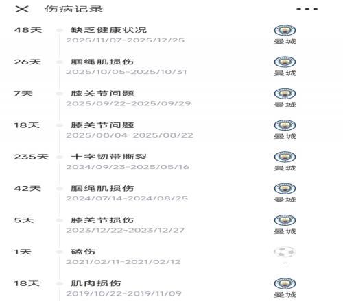 在2024年9月遭遇十字韧带撕裂重伤后,罗德里便饱受伤病困扰,最近5个月罗德里已经4次遭遇伤病,有3个多月处于养伤状态。目前29岁的罗德里德转身价为7500万欧元,他与曼城的合同还有1年半到期。
