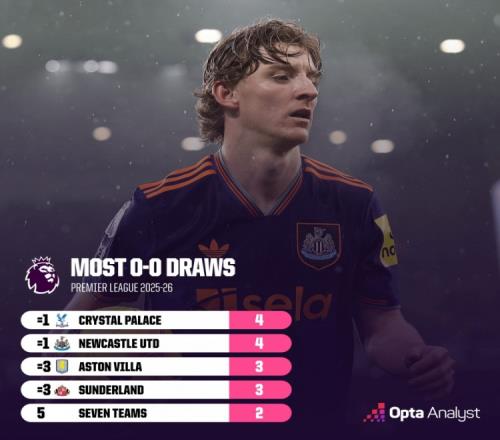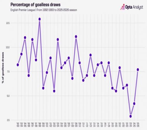 Opta指出,本赛季英超0-0比赛占比7.7%,2020-2021赛季(7.9%)之后最高。