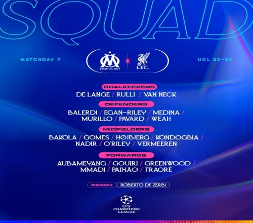 体育播报1月21日宣 北京时间明天凌晨,马赛将在欧冠联赛阶段第7轮比赛中主场对阵利物浦,马赛公布了此役的球员名单。