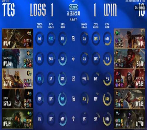 第二局Photic库奇对位送出一血给到JiaQi烬,但是iG借助前期Rookie妖姬强势还是掌握了比赛的主动权!中期双方你一波我一波,iG连续借助poke机会+Jwei牛头开团拿下大龙+电龙魂,但是TES双C非常顽强,配合369鳄鱼给控制连续顶住了iG的冲击,Creme沙皇推墙拦人+JiaQi烬不断输出,TES拿下二大龙+远古龙一度看到了获胜的希望!决胜的二远古龙团Jwei牛头顶走打野帮助iG拿下二远古龙,Wei猴子舍命开团留人,Photic库奇三杀收尾,iG经历45分钟大战艰难扳平比分!