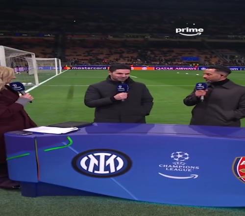 体育播报01月22日宣 欧冠3-1客胜国米赛后,阿森纳主帅阿尔特塔在评述席与沃尔科特、鲁尼互动。