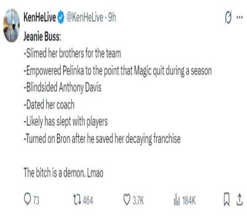 美记KenHeLive也总结了珍妮-巴斯的一些罪状,她评论珍妮:这女人真是一个恶魔。